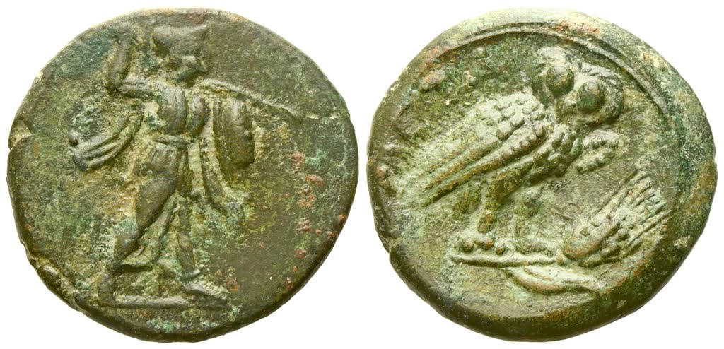 Athena Promachos advancing to right, brandishing spear and shield; Rv. Owl standing on grain ear to right, head facing; META upwards to left. Johnston, Bronze 68a; SNG Copenhagen 1254; HN Italy 1704; HGC 1, 1113. Lovely green patina. Good extremely fine.