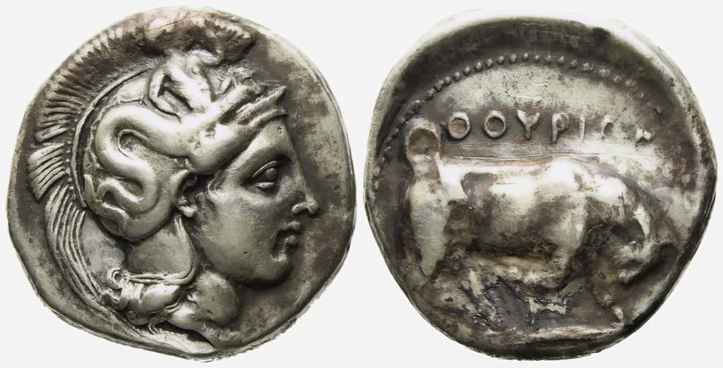 Head of Athena to r., wearing crested Attic helmet decorated with Skylla; Rv. [ΘΟΥΡΙΩΝ], bull butting r. HN Italy 1799. Some scratches in field due to old cleaning, otherwise good very fine.