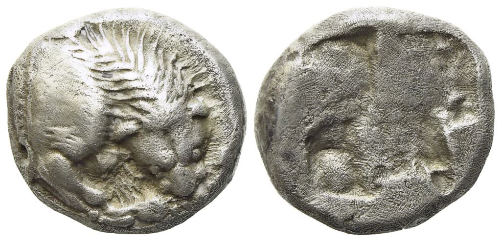 Forepart of lion right, eating prey; Rv. Quadripartite incuse square. Williams 8; HN Italy 1259; SNG ANS 1205-6. Well centred with all the design visible. Minor flan flaws on the reverse, otherwise near extremely fine.