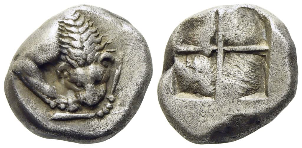 Forepart of lion right, eating prey; Rv. Quadripartite incuse square. Williams 8; HN Italy 1259; SNG ANS 1205-6. Well centred. Extremely fine.