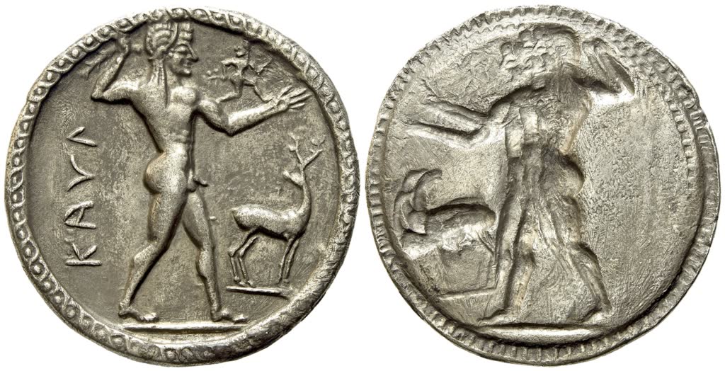 KAVL, Apollo, diademed, walking r., holding laurel branch in upraised r. hand; and small winged daimon running, holding long branch on outstretched l. arm; in r. field, stag r. on platform, with head reverted; Rv. The same type incuse l. without legend. Noe 14; McClean 1591; Boston 169; SNG ANS 147; HN Italy 2035. Traces of old cleaning. Fields gently smoothed. Possible minor tooling following cleaning, otherwise good extremely fine. Elegant style.