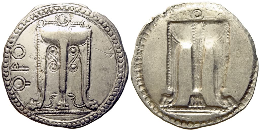 Delphic tripod with legs ending in lion's feet and a bowl with three rings; to left, ϘΡΟ; below bowl, between legs, two spirals; between feet, two snakes; beaded border; Rv.Tripod with legs ending in lion's feet and a bowl with three rings; rayed border; all incuse. Attianese 4; SNG ANS 239-241; HN Italy 2075; HGC 1, 1444. Minor traces of old oxidation removal. Extremely fine.