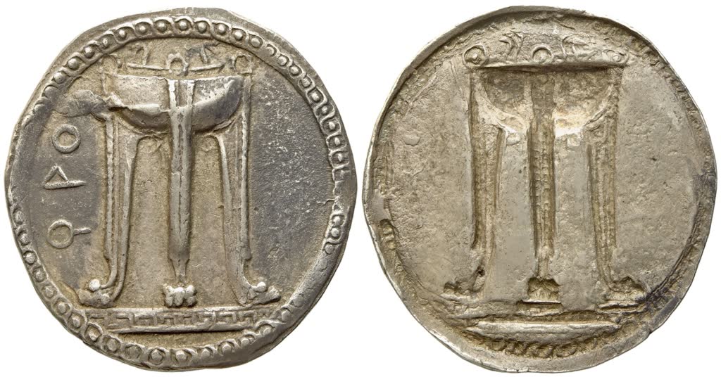 Delphic tripod with three legs terminating in lion's feet, two serpents emerging from bowl, set on exergual line with meander pattern, cable and pellet border, ϘΡΟ to left; Rv. Delphic tripod incuse in flan. HN Italy 2075; SNG ANS 230; SNG Copenaghen 1735. About extremely fine.