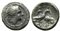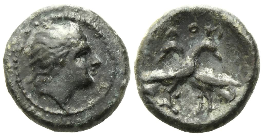 Head of horned river god r. / [ΣΤ]Α ΟΨΙ, two birds passing to l. and r. SNG ANS 149; HN Italy 2307. Extremely rare. Dark patina. Near extremely fine.
