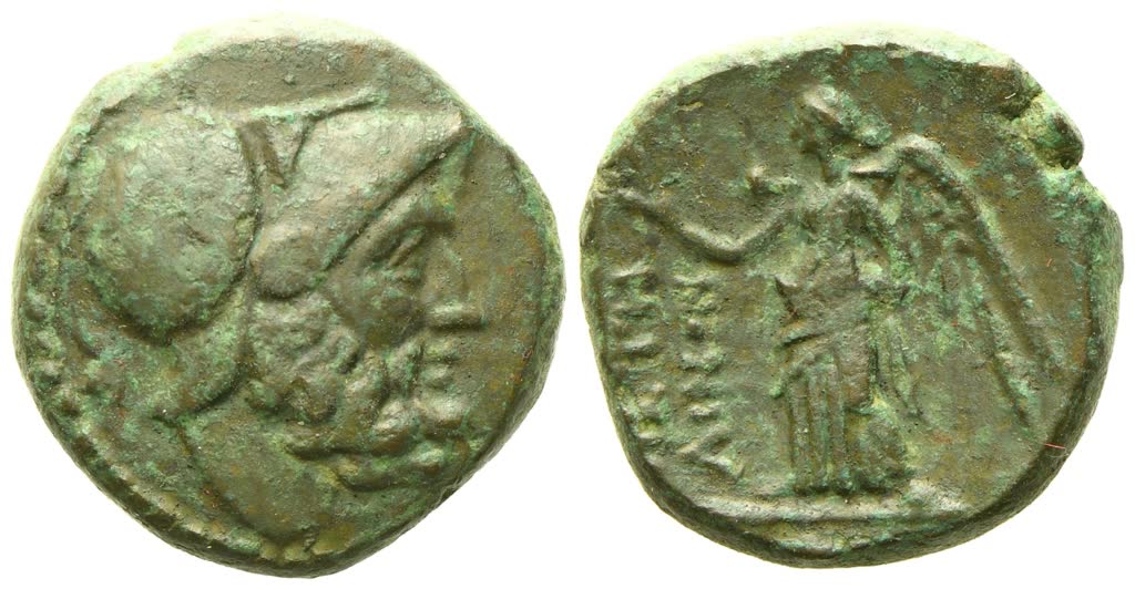 Helmeted head of Ares to r.; Rv. Nike standing to l., holding wreath; ΠETH – ΛINΩN in two lines to l.. SNG ANS 607; HN Italy 2456; HGC 1, 1616. Lovely green patina. Extremely fine.