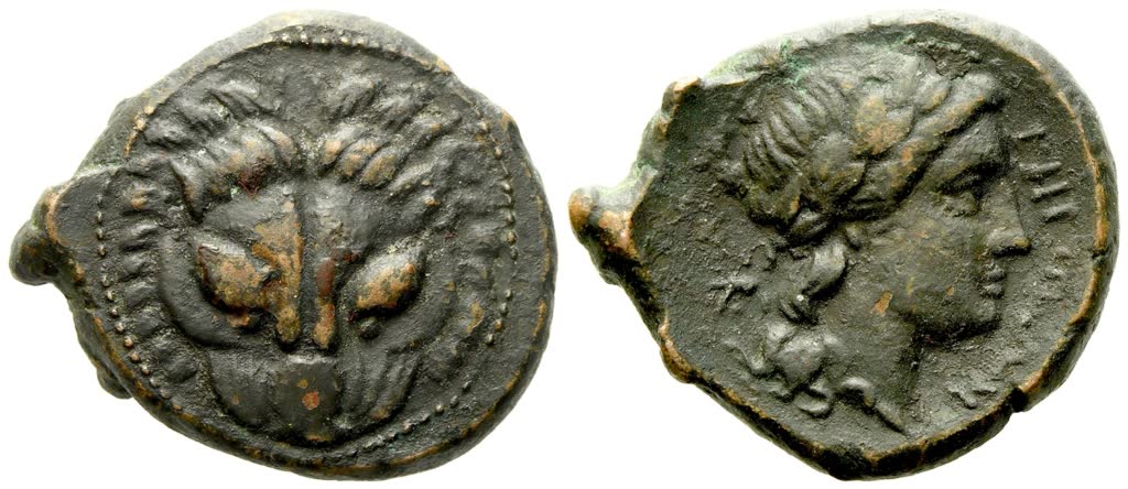 Lion's head facing; Rv. Laureate head of Apollo right; uncertain symbol behind. HN Italy 2534; SNG ANS 685-688. Dark brown patina with lighter hues. Extremely fine.