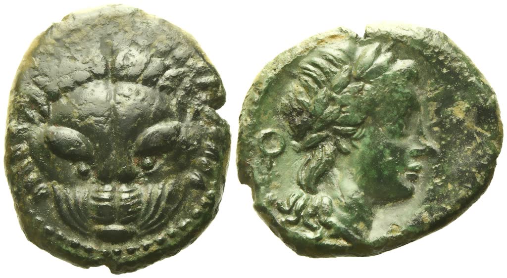 Lion mask; Rv. [ΡHΓINΩN], head of Apollo r.; behind, laurel wreath. SNG Cop. 1945; SNG Munich 1633; SNG ANS 686; HN Italy 2534. Lovely green patina with darker hues. Good very fine / near extremely fine.
