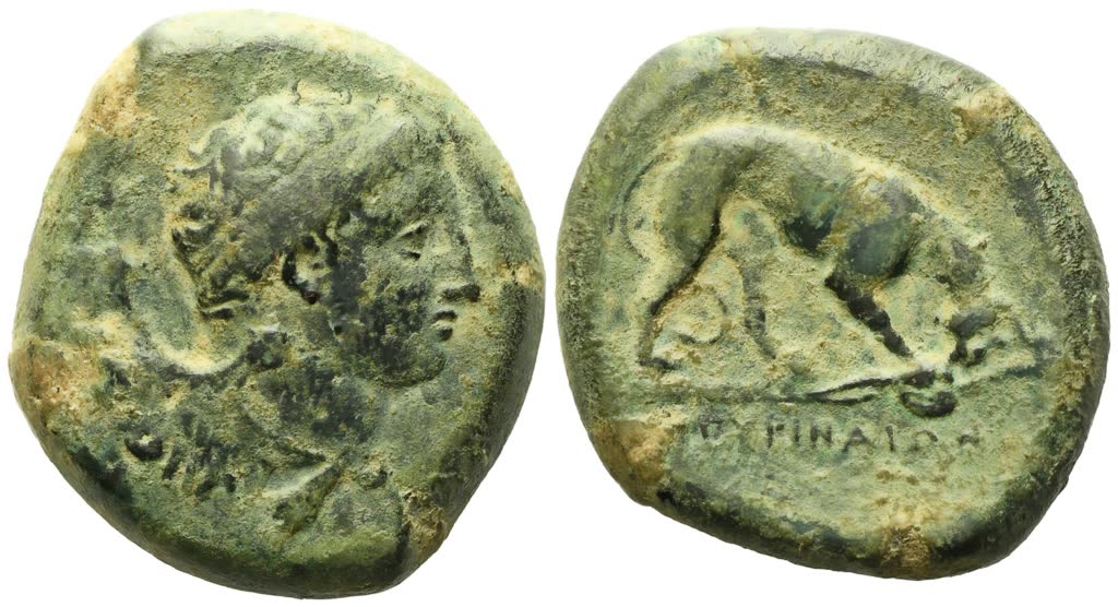 Head of young Herakles r., wearing tainia, lion skin tied around his neck; Rv. Panther standing r. on ground, devouring prey; AΓYPINAIΩN in exergue. CNS III, 12; Campana 12; SNG ANS 1167; HGC 2, 50. Rare. Appealing green patina. About extremely fine. Refined style.