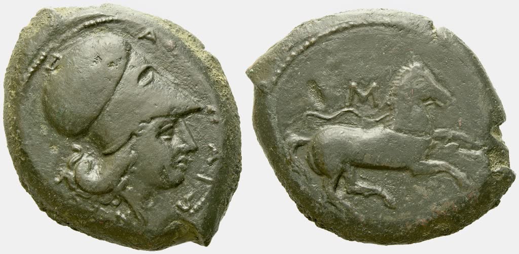 Head of Athena r., wearing Corinthian helmet; ΑΙΤΝΑΙΩΝ before; Rv. Horse with trailing rein prancing r.; M above. CNS 1; SNG ANS 1301; Buceti 4; HGC 2, 72. Dark patina. Good very fine.