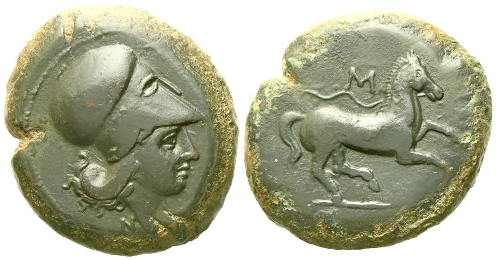 Head of Athena r., wearing Corinthian helmet; ΑΙΤΝΑΙΩΝ before; Rv. Horse with trailing rein prancing r.; M above. CNS 1; SNG ANS 1301; Buceti 4; HGC 2, 72. Dark patina. Good very fine.