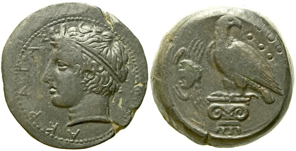 Diademed head of river-god left, ΑΚΡΑΓΑΣ before; Rv. Eagle standing l. on Ionic column, head r.; crab to left, six pellets (mark of value) to right. CNS 89; SNG ANS 1097-1101. Dark patina. Slight traces of delicate cleaning and gentle smoothing, otherwise good very fine.