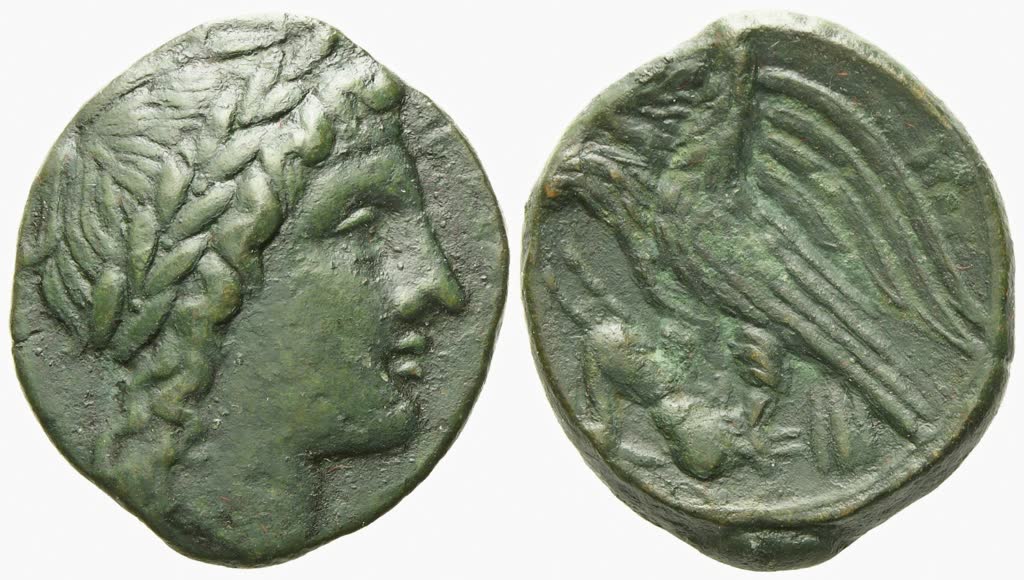 Beardless, laureate head of Zeus Hellanios r.; Rv. Two eagles standing l. on hare, the one in background with raised wings and attacking the hare with beak, the one in foreground with folded wings and raising head to scream. CNS I 125; Sear 1030 var.; HGC 159. Dark green patina. Near extremely fine.