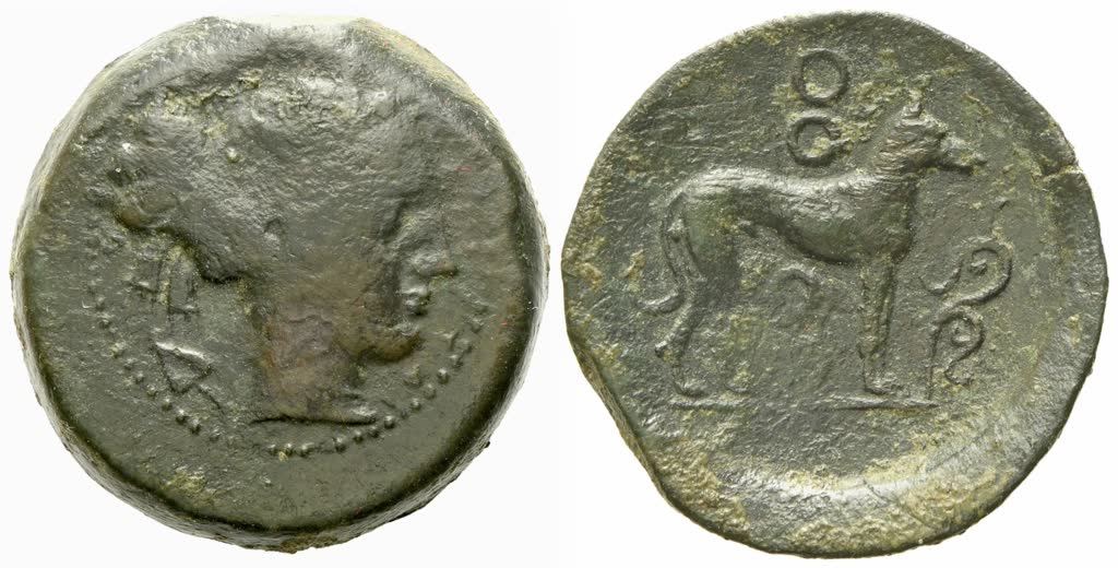 Head of the nymph Aigiste r. ivy leaf behind; Rv. Hound standing r., four annulets; volute to r. CNS I, 31; HGC 2, 1183. Dark green patina. Very fine / good very fine.