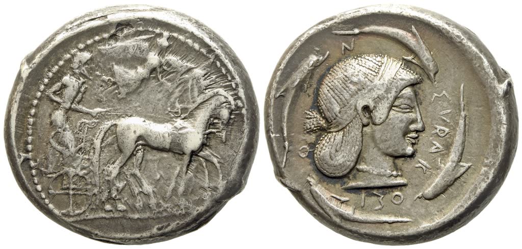 Slow quadriga driven r. by charioteer, holding reins and kentron; above, Nike alighting r. to crown the horses; Rv. Diademed head of Arethusa r., wearing necklace. Around, four dolphins swimming clockwise. Boehringer 116; SNG ANS 29. Good very fine / near extremely fine.
