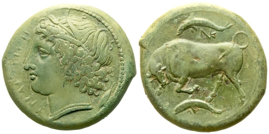 Syracuse, c.ca 317-310 BC. ΣYPAKOΣIΩN, head of Kore l., wearing wreath of grain and necklace; at r., symbol; dotted border; Rv. Bull butting l.; above and below, two dolphins; above NK (monogram). Buceti 777; CNS II, 96; SNG Copenhagen 757; SNG ANS 567 var. Lovely light green patina; refined style. Near extremely fine.