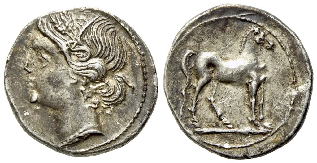 Wreathed head of Tanit left / Horse standing right. MAA 78; SNG Copenhagen 335. Rare. Extremely fine.