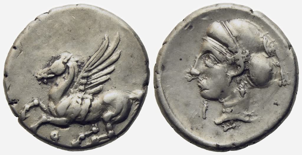 Pegasos flying to l., koppa below; Rv. Head of Aphrodite l., wearing sakkos, pendant earrings and necklace, I to left. BCD Corinth 169 var. (monogram); BMC 355, pl. X, 24; SNG Copenhagen 114. Extremely fine. Refined style.