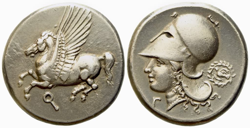 Ϙ, Pegasos flying l., Rv. Head of Athena to left, wearing Corinthian helmet; behind, dove flying left within wreath; below chin, Γ. BCD Corinth 110; Calciati 419; Ravel 1029. Evidence of old cleaning. Fields gently smoothed, otherwise near extremely fine / good extremely fine.