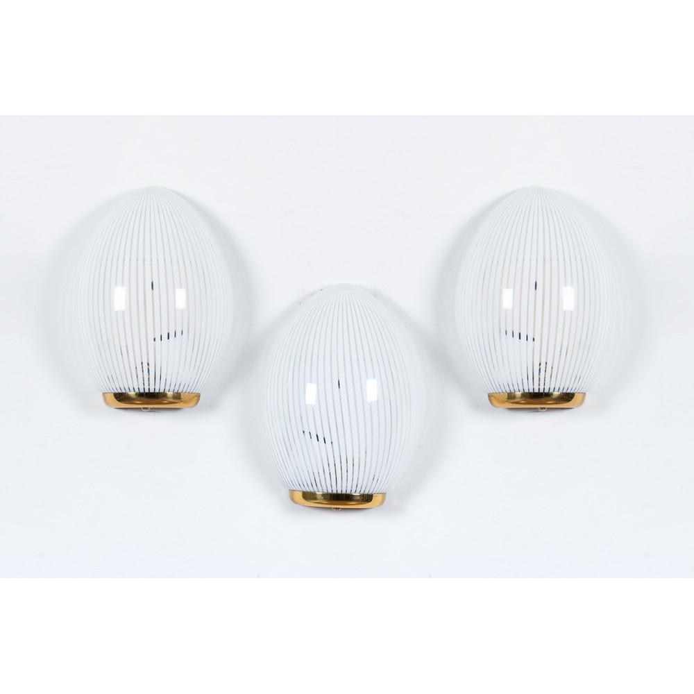 Tre lampade da parete ad una luce della serie “Tessuti”, struttura in ottone con diffusore ovalizzato in vetro incolore a tessuto lattimo.