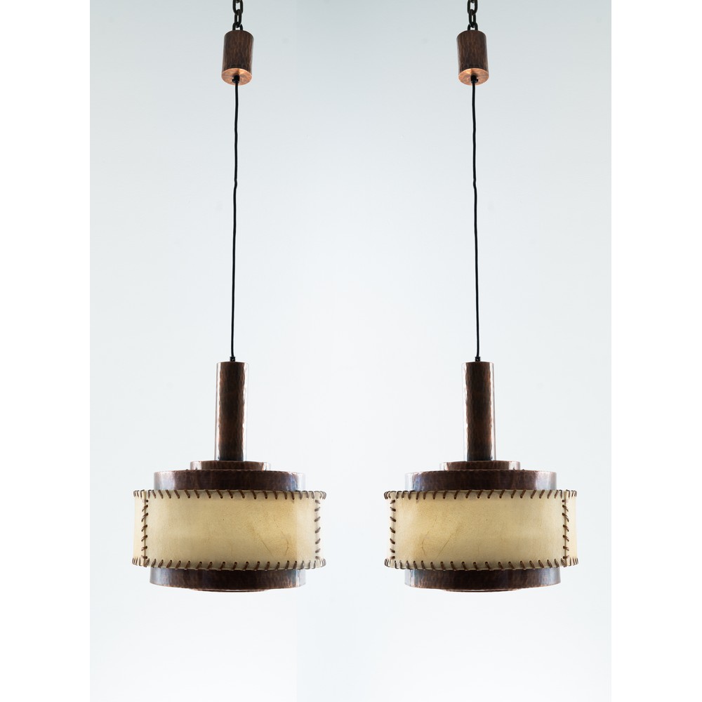 Coppia di lampade a sospensione, struttura in rame martellato, diffusore circolare in pergamena cucita con nastro di cuoio marrone. Impianto elettrico originale.