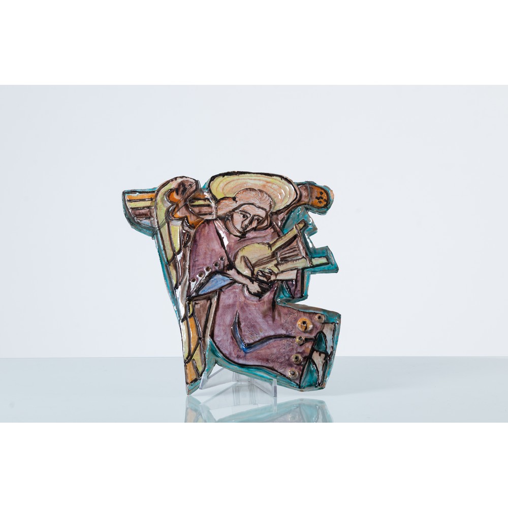 Placca in ceramica smaltata ed invertriata raffigurante “angelo suonatore”, decorata in policromia.