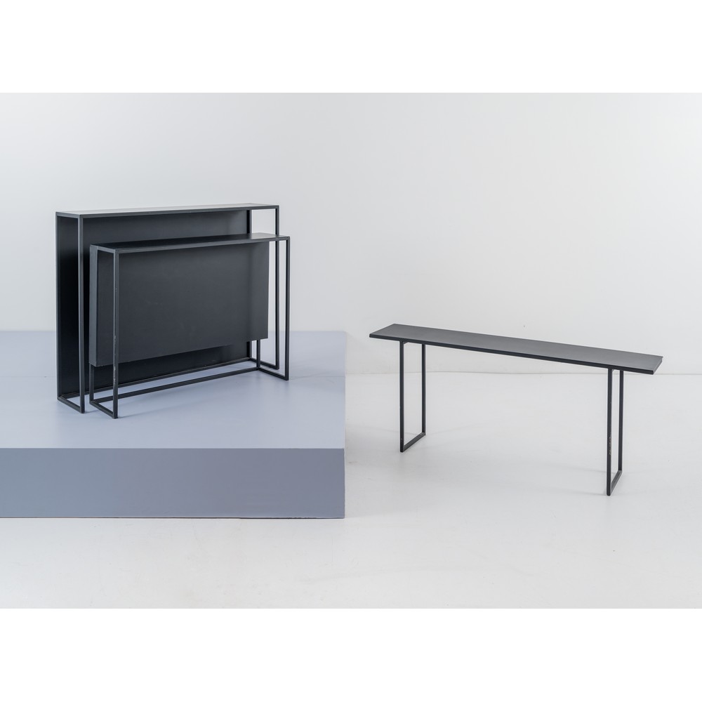 Due consolle impilabili ed un piano d'appoggio basso con struttura e tamponatura in metallo verniciato nero.