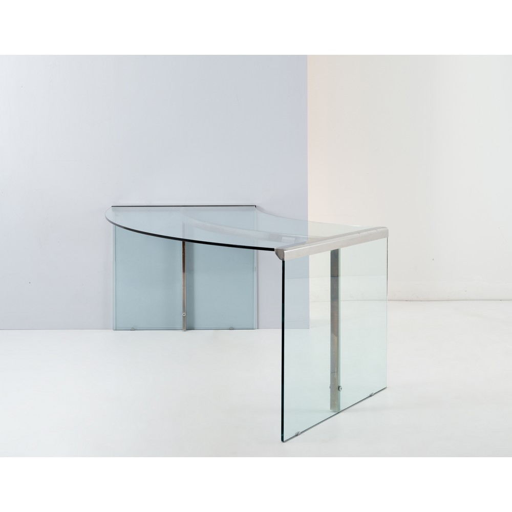 Una scrivania modello “President Senior” struttura in ottone cromato, piano sagomato e fianchi in cristallo extra white. Etichetta della Manifattura.