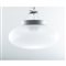Lampada a sospensione a sei luci con diffusore sferico schiacciato in plastica bianca, struttura in metallo verniciato grigio, cavi in acciaio.