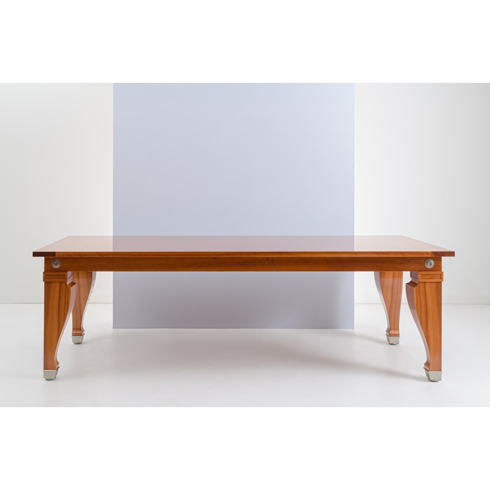 Tavolo da pranzo in legno di ciliegio massello, piano rettangolare con piedi sagomati e decori in ottone nichelato e satinato opaco.