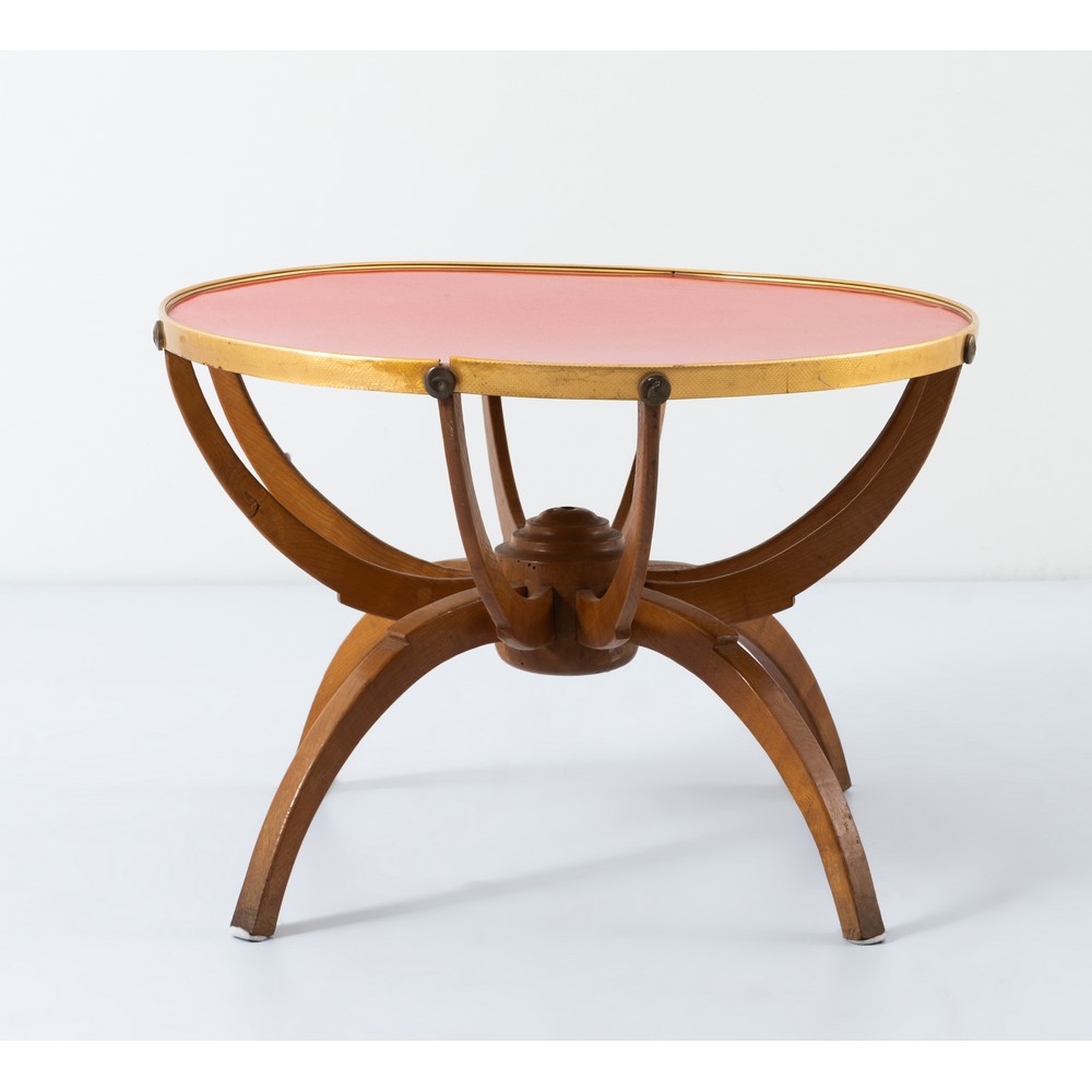 Tavolo da salotto della serie “Ragno”, struttura in legno, piano in formica rossa con bordo in alluminio dorato. Segni di uso e lievi difetti.