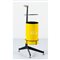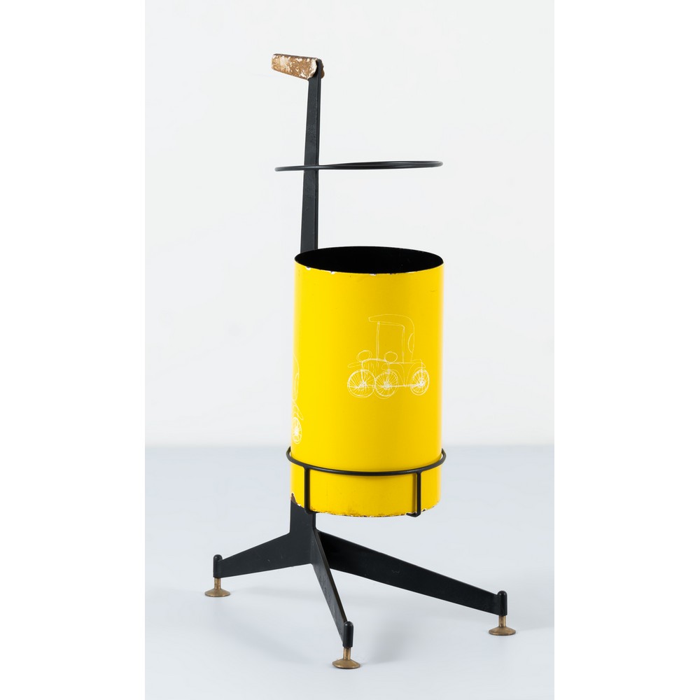 Portaombrelli con struttura in metallo verniciato nero, ottone, contenitore cilindrico in metallo smaltati e decorato con disegno di automobile. Segni di uso, ossidazioni e cadute smalto.