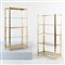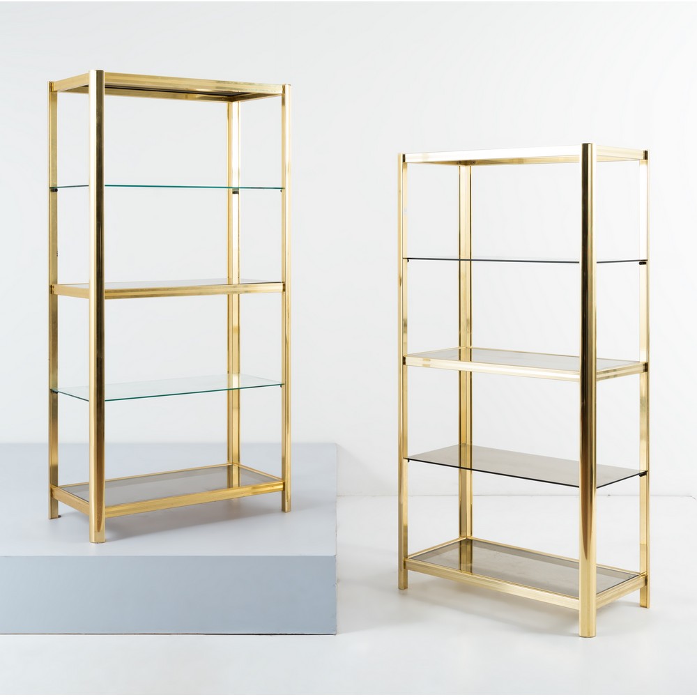 Coppia di librerie con struttura in metallo dorato lucido, cinque ripiani rettangolari in vetro incolore e fumè. Segni di uso.