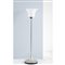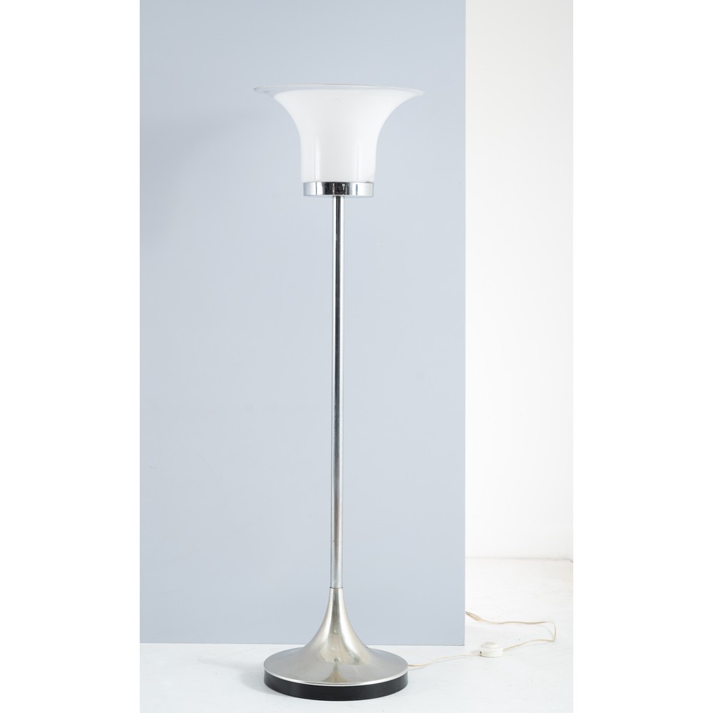 Lampada da terra ad una luce, struttura in metallo cromato, diffusore a campana in vetro lattimo e trasparente, base circolare conica, impianto elettrico originale.