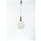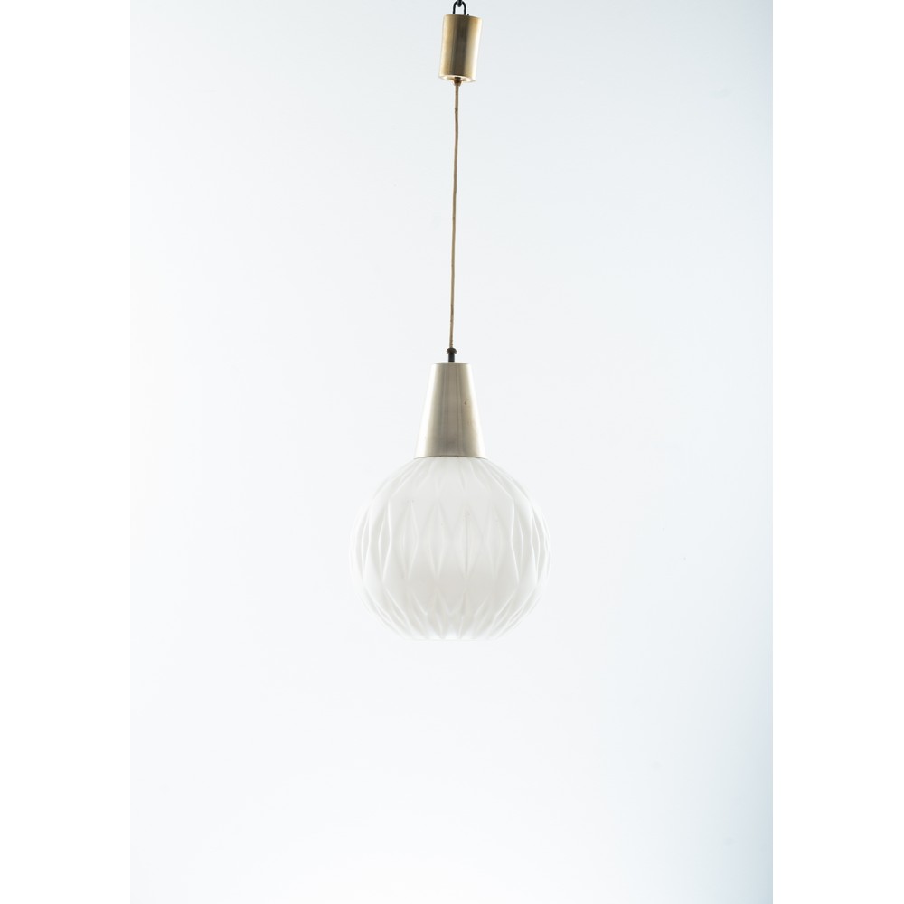 Lampada a sospensione ad una luce, struttura in metallo con diffusore sferico in vetro opalino lattimo decorato a stampo con rombi verticali, difetti.