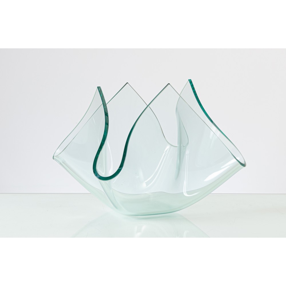 Centrotavola modello “Cartoccio” in cristallo trasparente sagomato a caldo. Marchio di produzione.