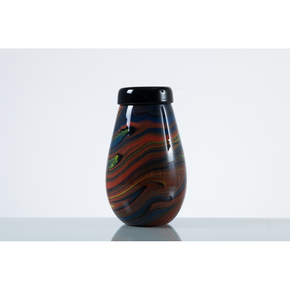 Vaso in vetro incamiciato nero e decorato ad effetto marmorizzato in policromia, corpo a goccia, collo sovrapposto con bocca piana circolare in vetro nero, base circolare. Marchio di produzione.