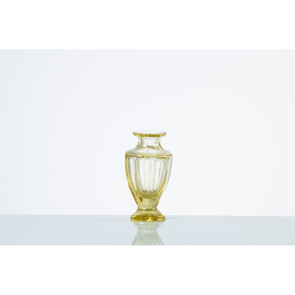 Vaso in cristallo pagliesco, corpo ovalizzato con larghe costolature verticali, collo a tromba e bocca circolare. Firma alla base.
