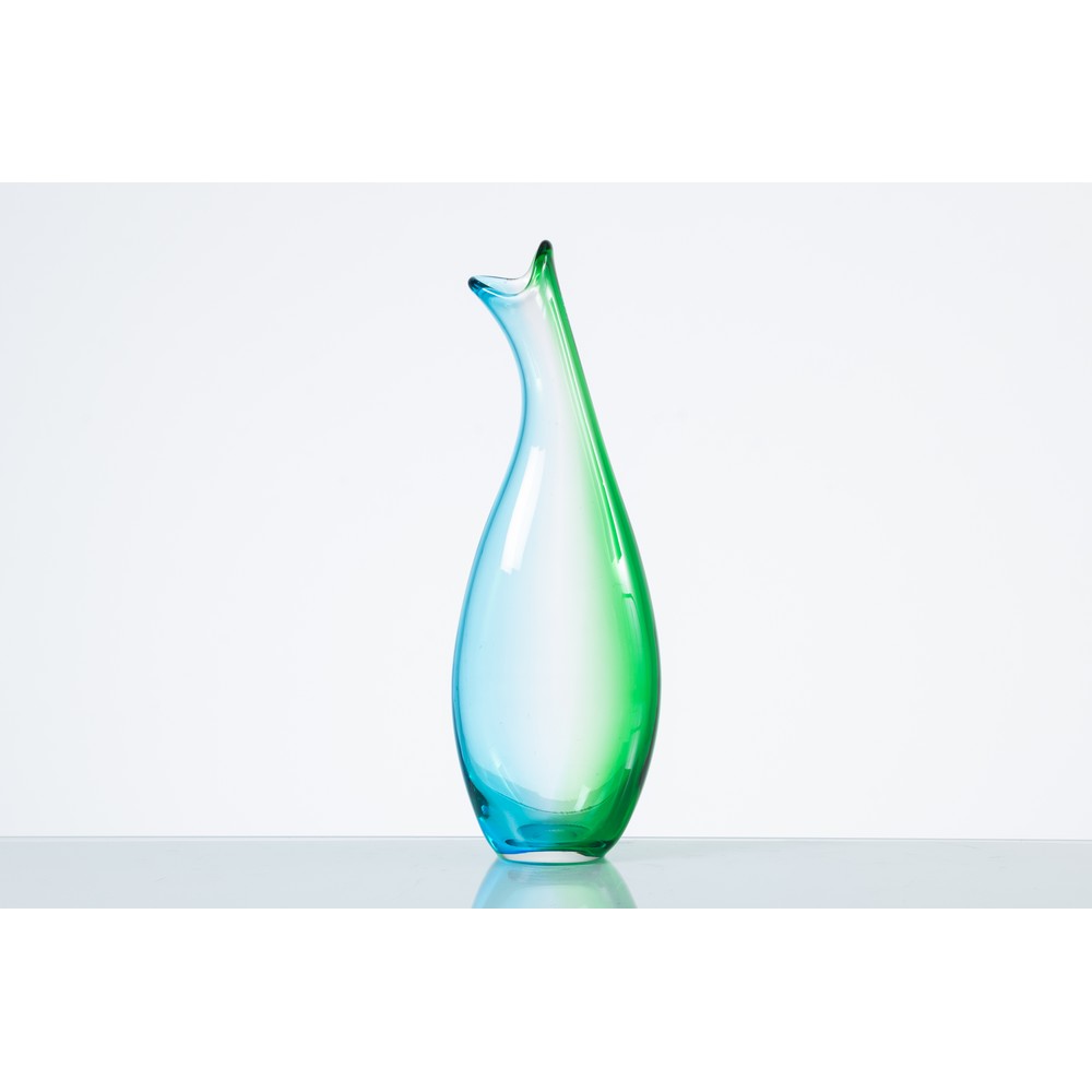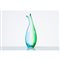 Vaso in vetro sommerso incolore, verde e blu, corpo a goccia con collo inclinato, bocca sagomata, base circolare.