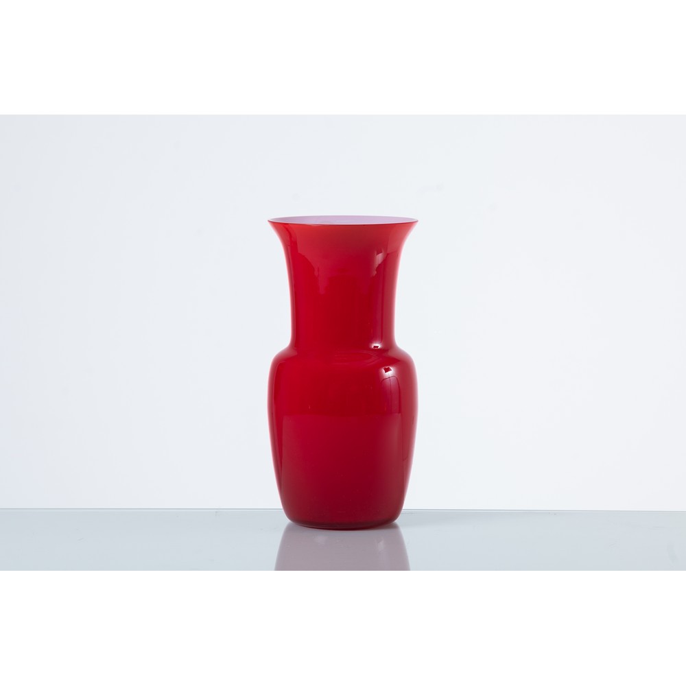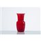 Vaso in vetro incamiciato rosso e bianco, corpo ovalizzato con largo collo a svasare e bocca piana circolare.