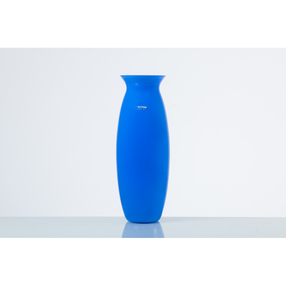 Vaso in vetro blu con corpo ovalizzato, collo lievemente strozzato con bocca circolare a vaso. Etichetta di produzione e firma all’acido laterale.
