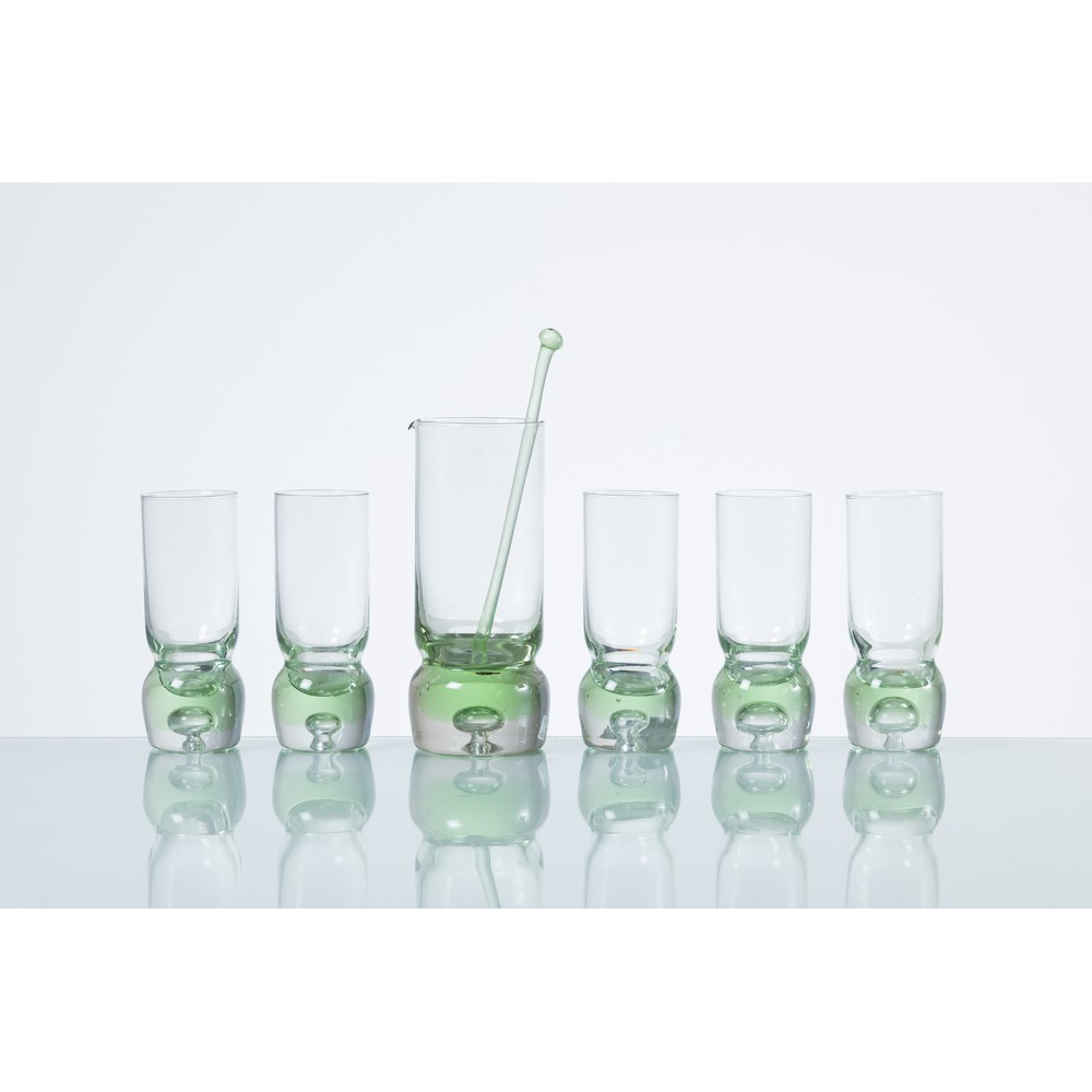 Cinque bicchieri ed una caraffa in vetro incolore decorato alla base in verde, corpo cilindrico con strozzatura alla base di grosso spessore.
