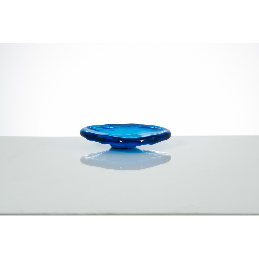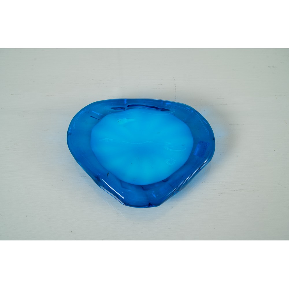 Svuota tasche in vetro sommerso blu, corpo triangolare con angoli arrotondati, grossa murrina centrale in vetro lattimo.