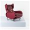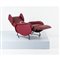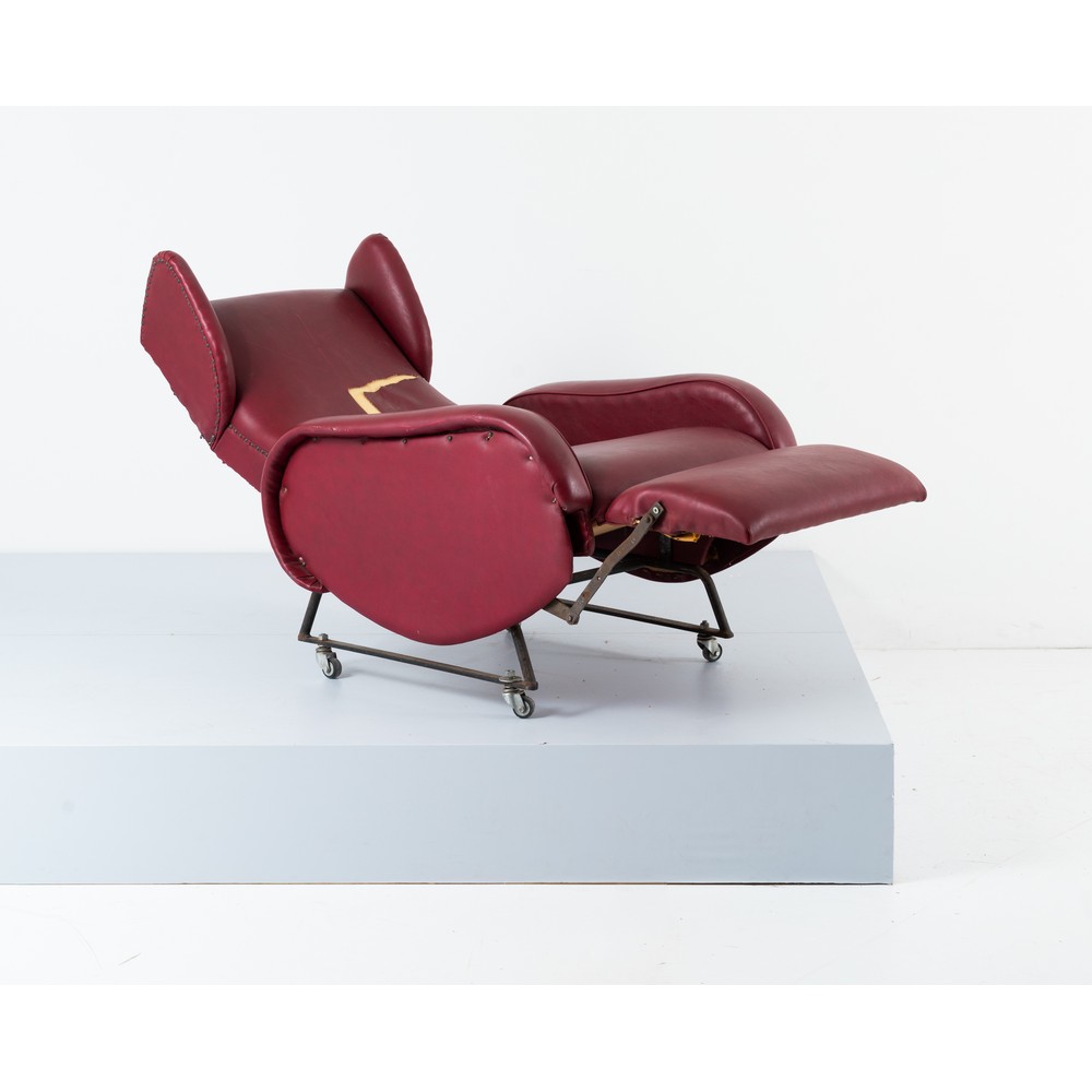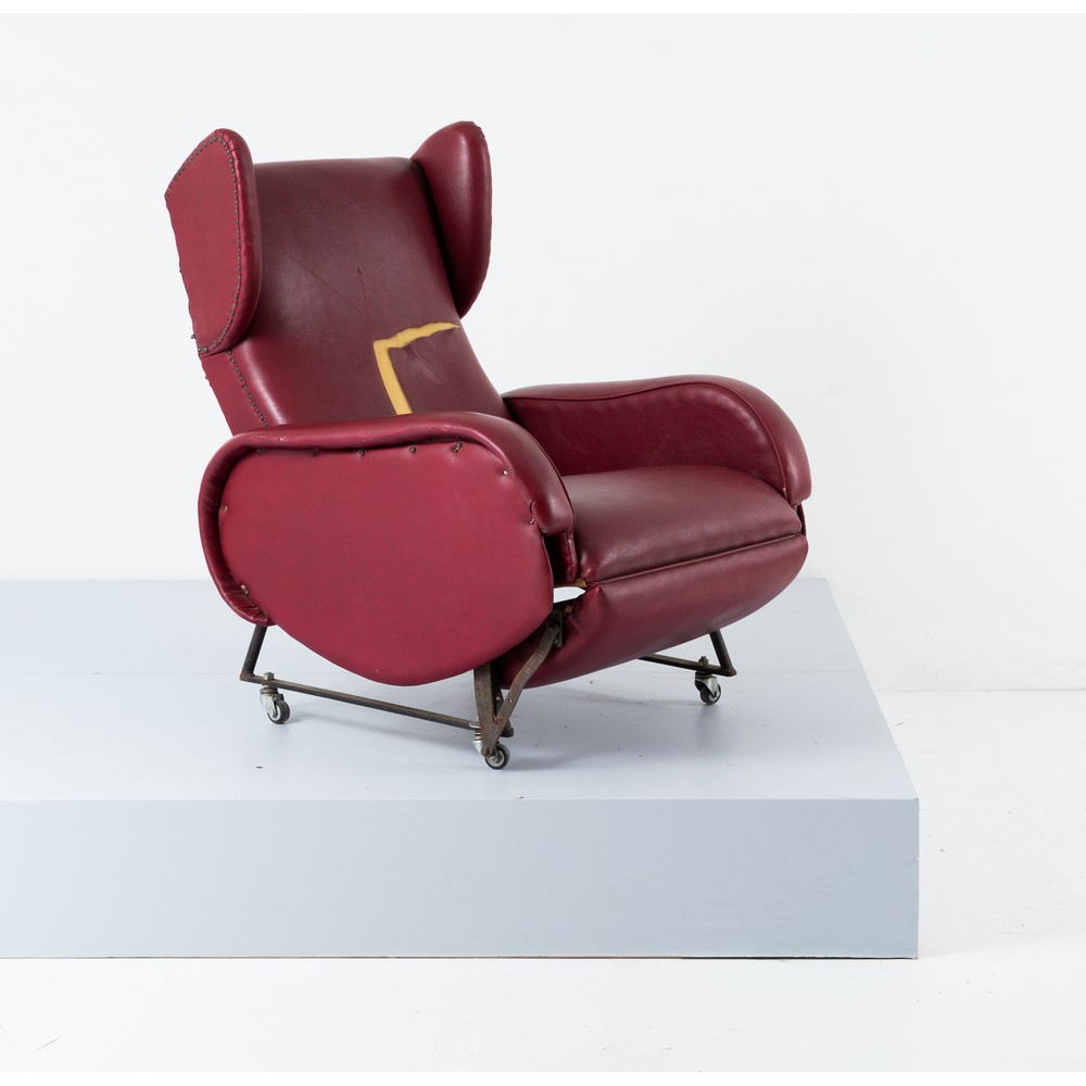 Poltrona reclinabile con struttura in metallo, imbottitura e rivestimento in skai bordeaux, base con ruote. Difetti, usure e strappo lungo la spalliera.