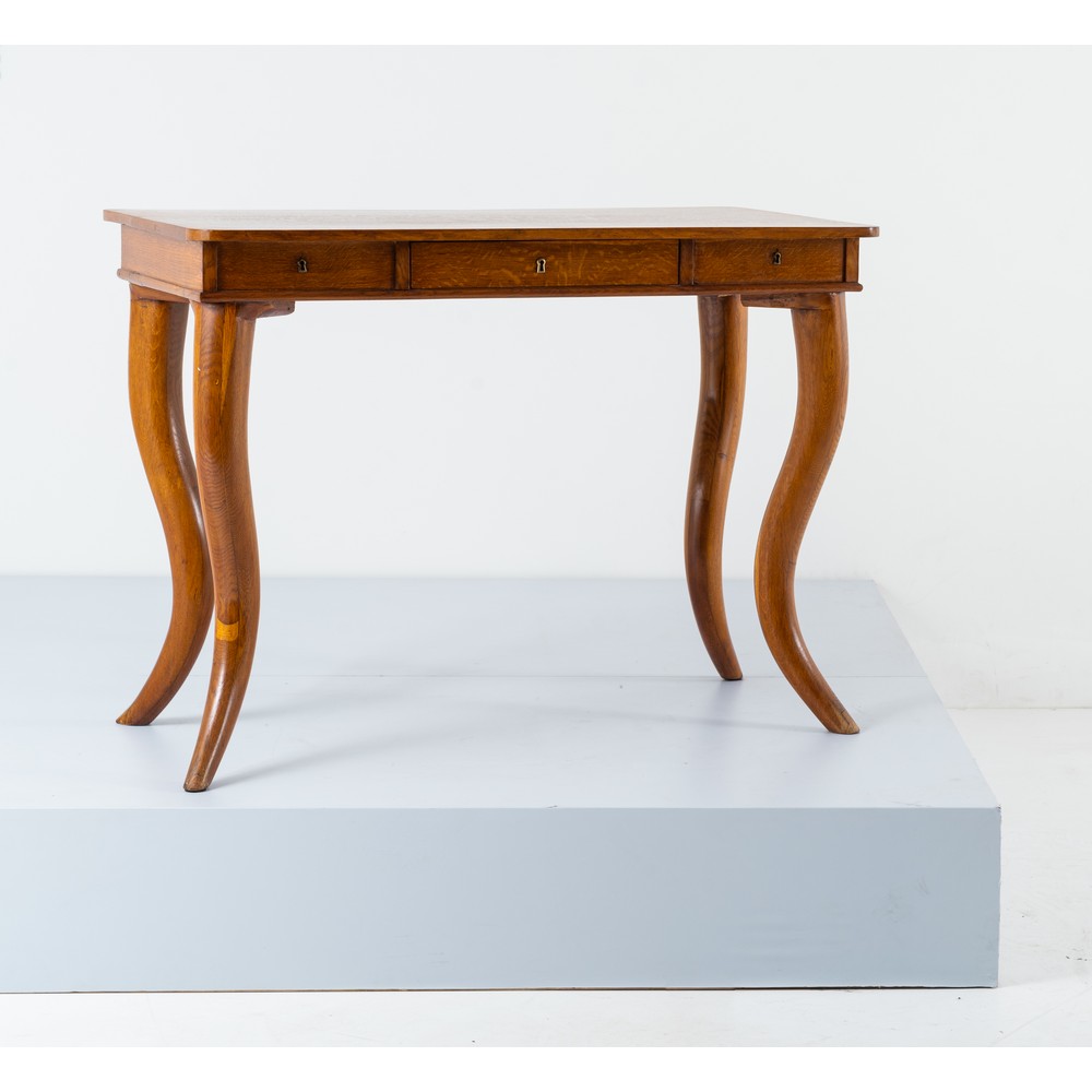 Scrivania in legno massello di rovere, piano rettangolare, tre cassetti sul fronte, gambe sagomate, minuterie in ottone.