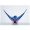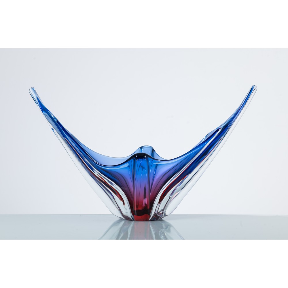 Grande coppa in vetro sommerso incolore, lilla e blu, corpo a coda di pesce con base circolare.