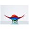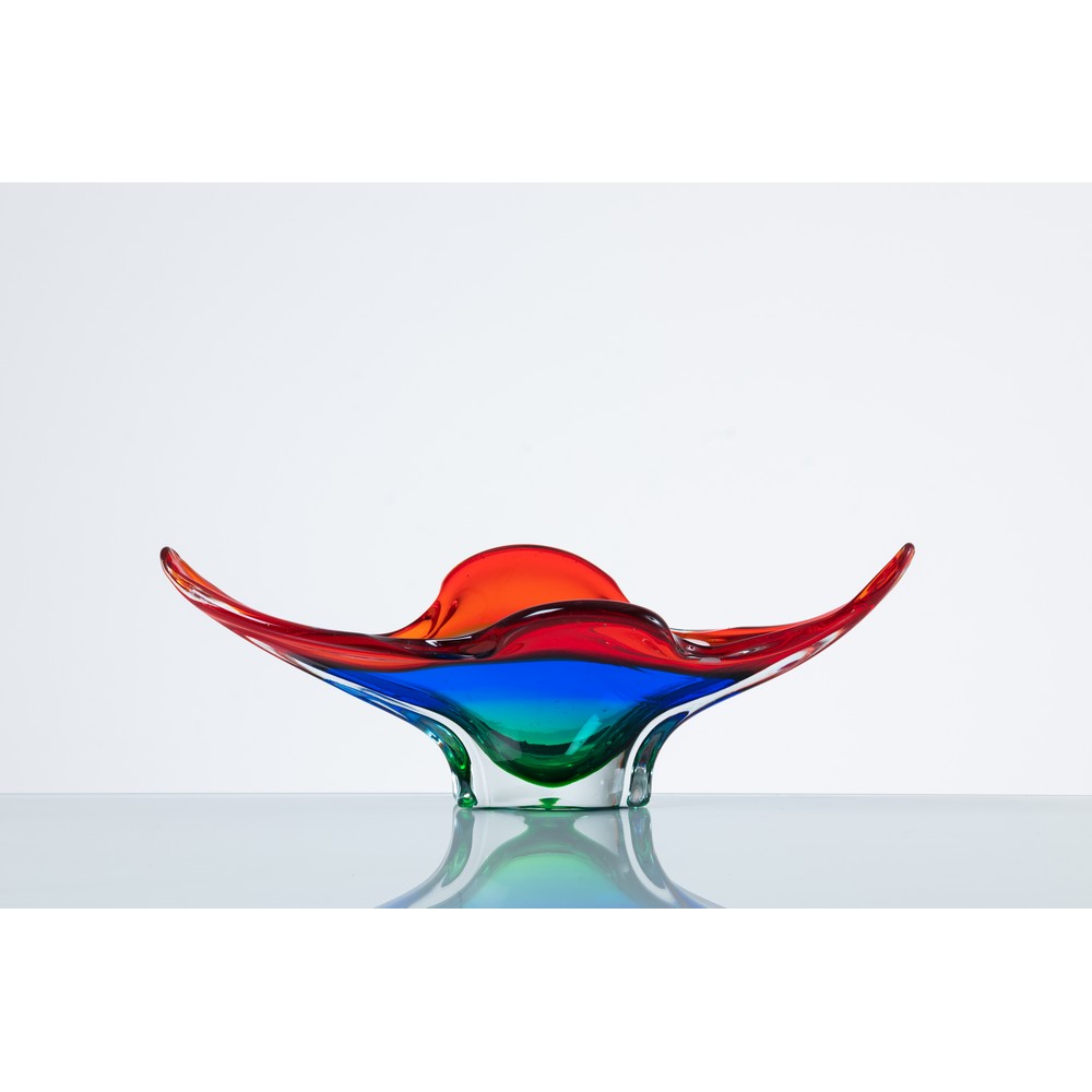 Coppa in vetro sommerso incolore, verde, blu e rosso, corpo a coda di pesce con base quadrangolare.