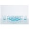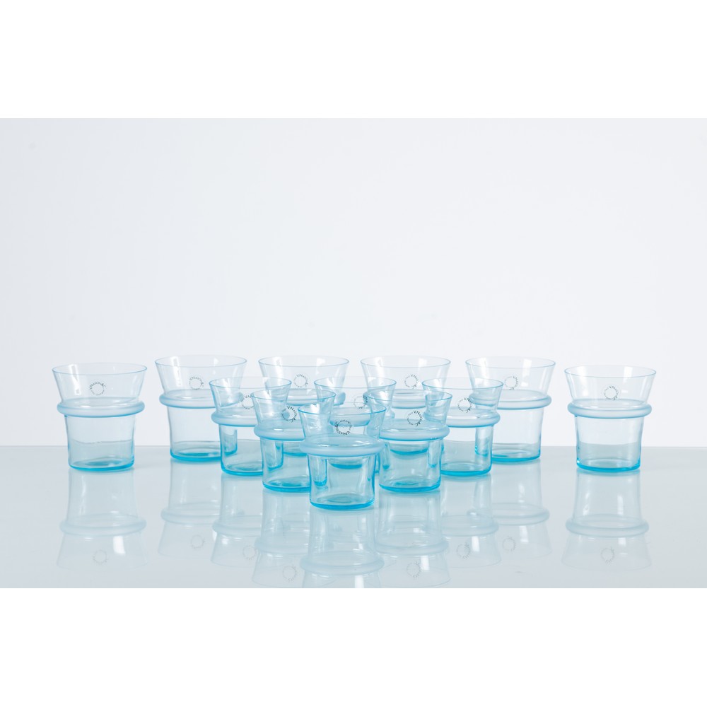 Dodici bicchieri in vetro soffiato celeste, sei da acqua e sei da vino, corpo a vaso con elemento ad anello a rilievo in vetro satinato. Etichetta di produzione.