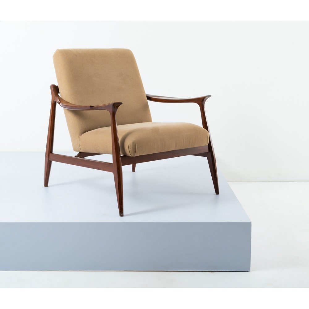 Poltrona con struttura in legno di teak con seduta e spalliera imbottite e rivestite con tessuto nei toni del beige, sagomature e curvature nelle parti lignee.