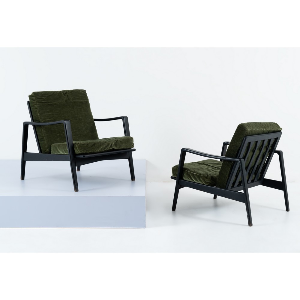 Coppia di poltrone modello “no. 30”, struttura in legno ebanizzato, seduta e spalliera con cuscini imbottiti e rivestiti con tessuto di velluto verde. Segni d’uso e qualche graffio.