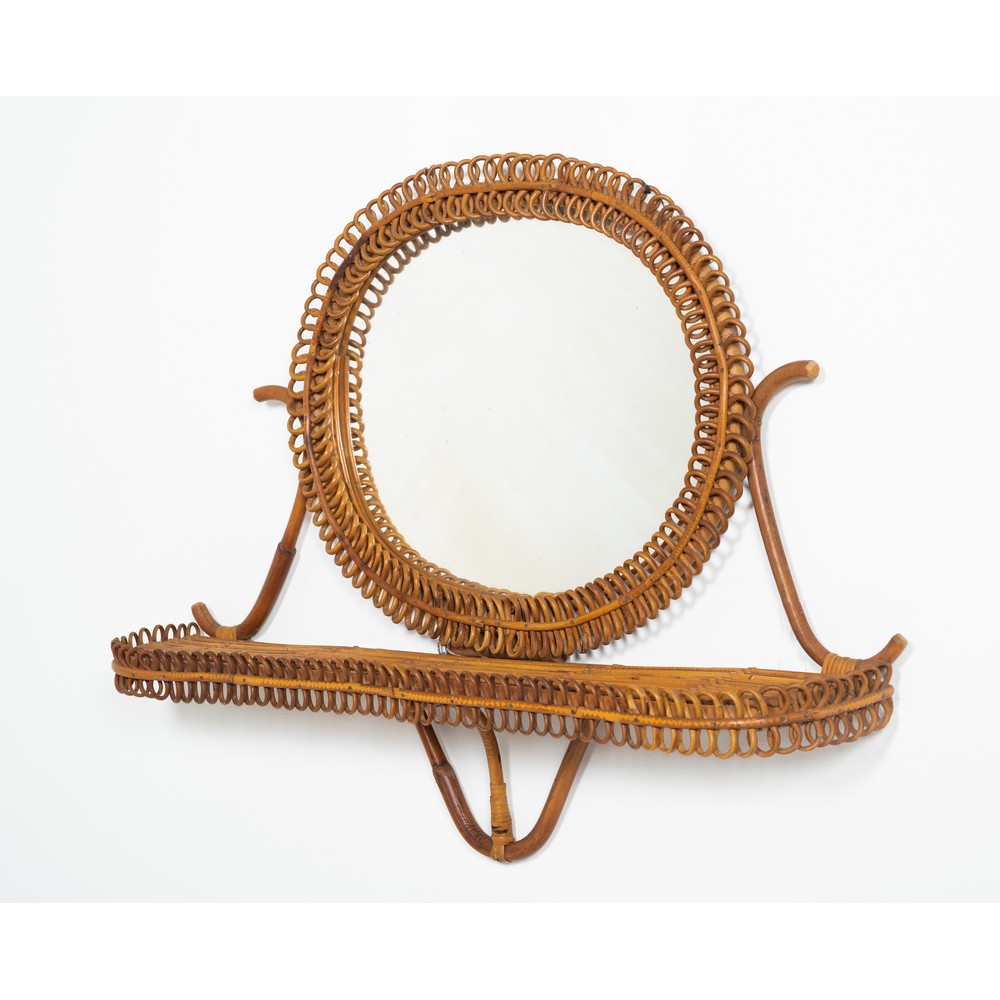 Specchio da parete circolare con mensola in rattan, elementi di decoro curvati a vapore, cristallo specchiato.